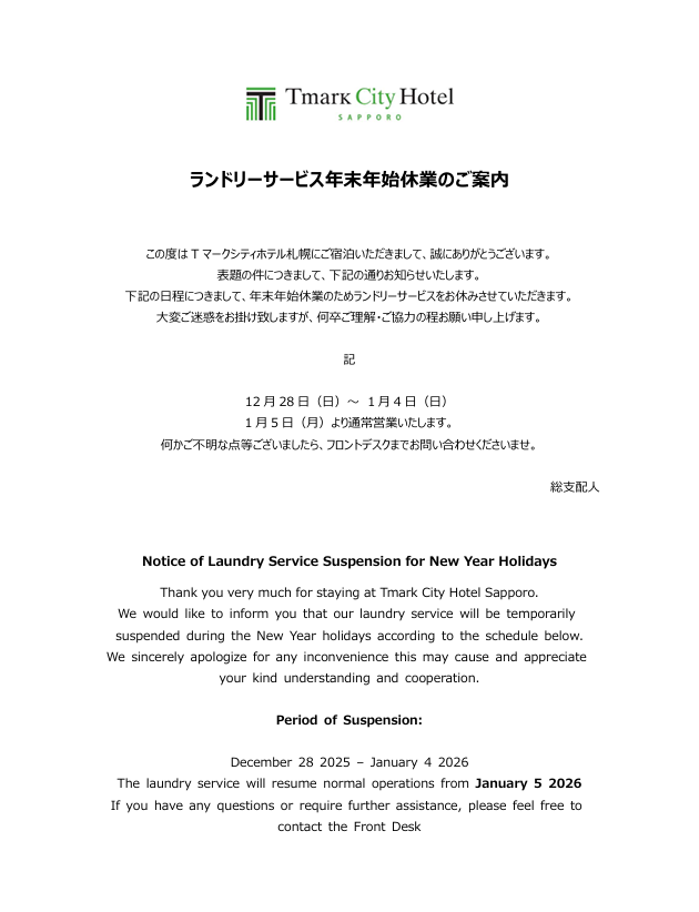 • ランドリーサービス年末年始休業のご案内