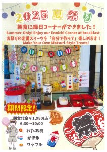 お祭りの音や冷たいスイーツが恋しくなるこの季節、当ホテルの朝食会場に「縁日コーナー」が新登場しました♪朝からちょっぴりお祭り気分を味わえる、夏限定の特別なコーナーです♪